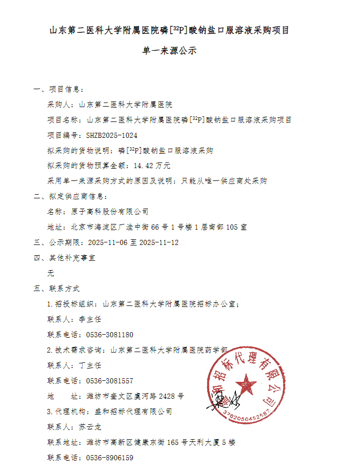 【山东第二医科大学附属医院】山东第二医科大学附属医院磷〔32P〕酸钠盐口服溶液采购项目单一来源公示