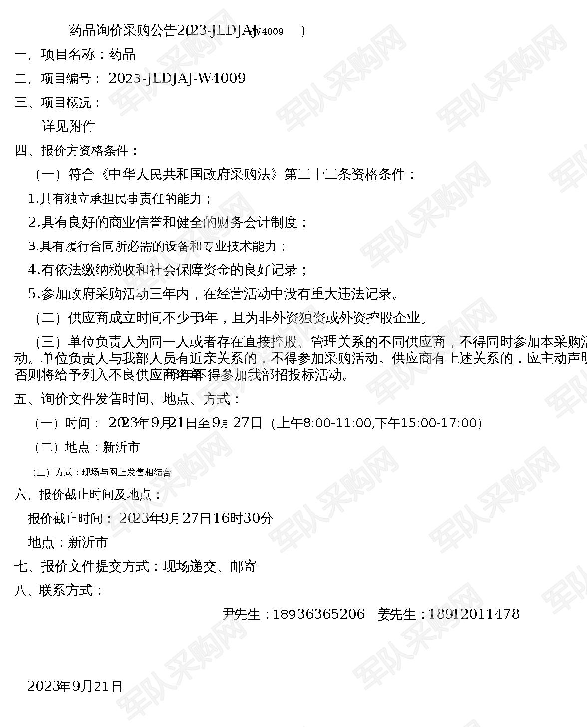 【军队采购】军队采购网药品询价采购公告(2023-JLDJAJ-W4009)