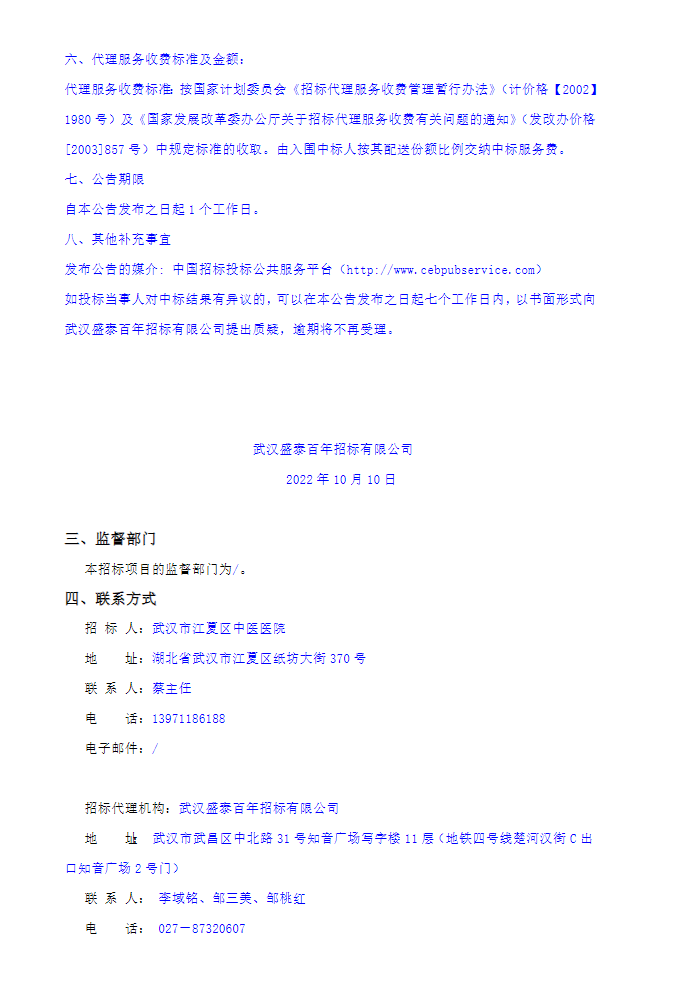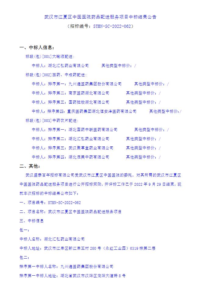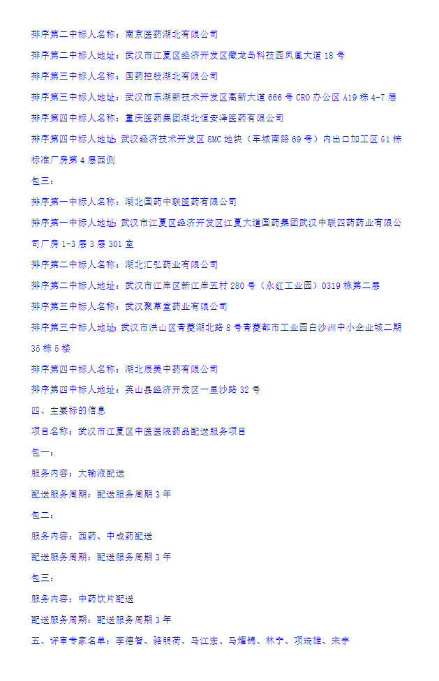 【湖北省武汉市江夏区中医医院】药品配送服务项目中标结果公告