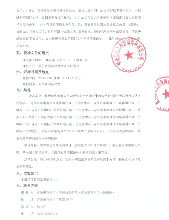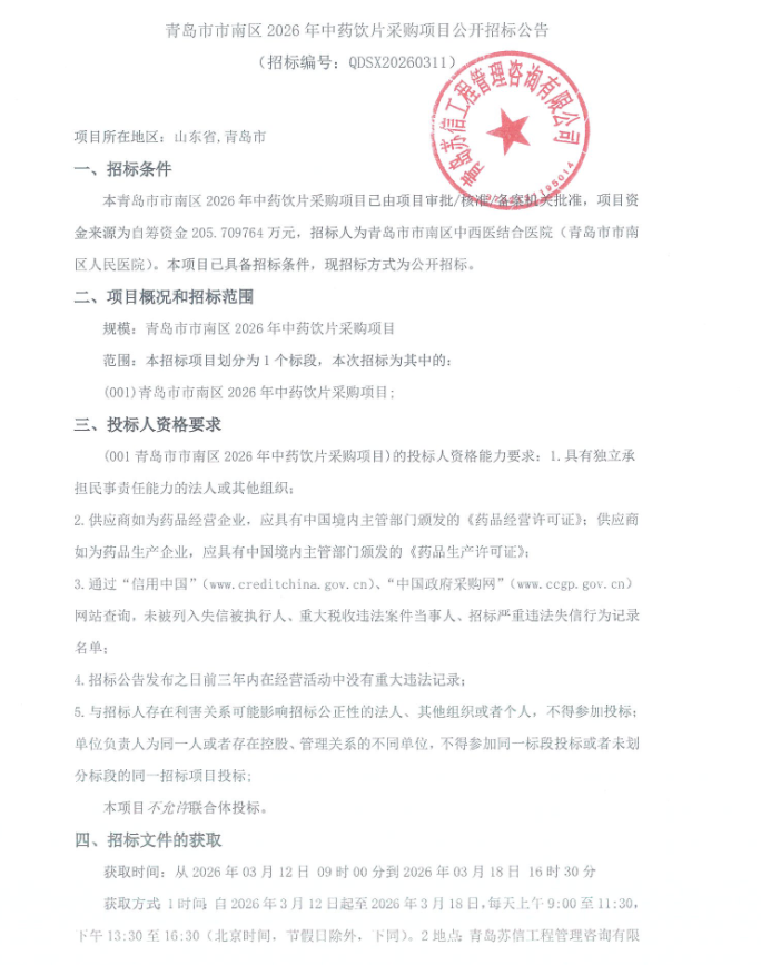 【青岛市市南区中西医结合医院】山东省青岛市市南区中西医结合医院2026年中药饮片采购项目公开招标公告