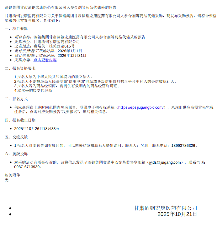 【甘肃酒钢宏康医药有限公司】酒钢集团甘肃酒钢宏康医药有限公司人参合剂等药品代储采购预告