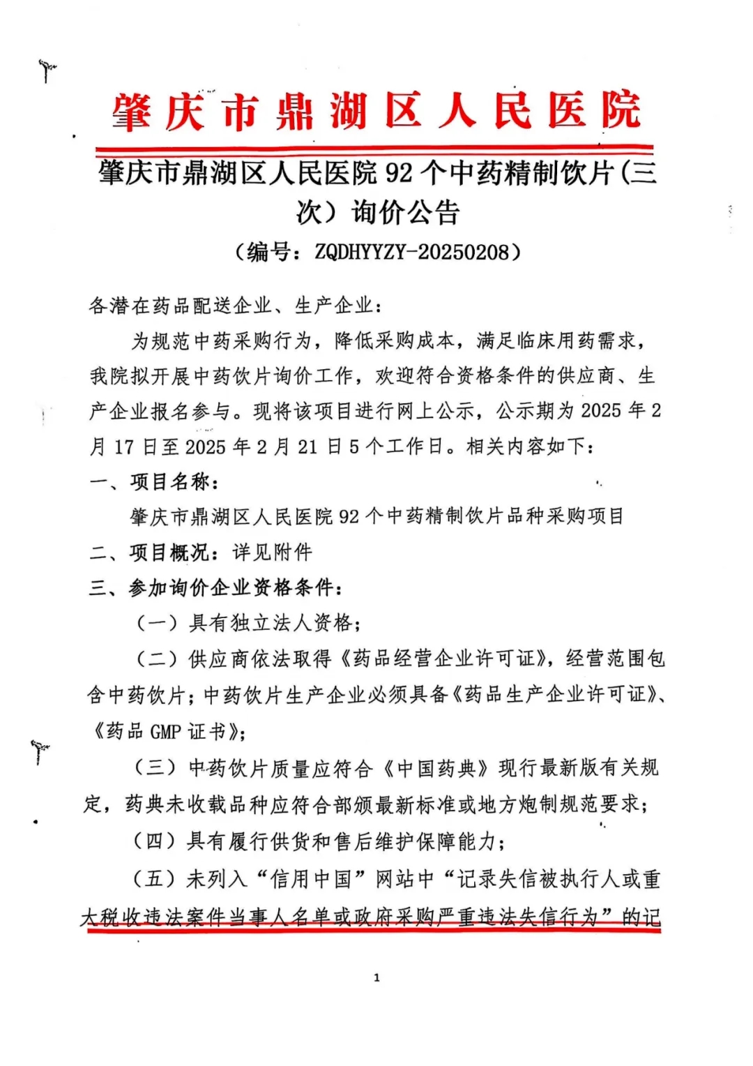 【肇庆市鼎湖区人民医院】广东省肇庆市鼎湖区人民医院92个中药精制饮片(三次)询价公告