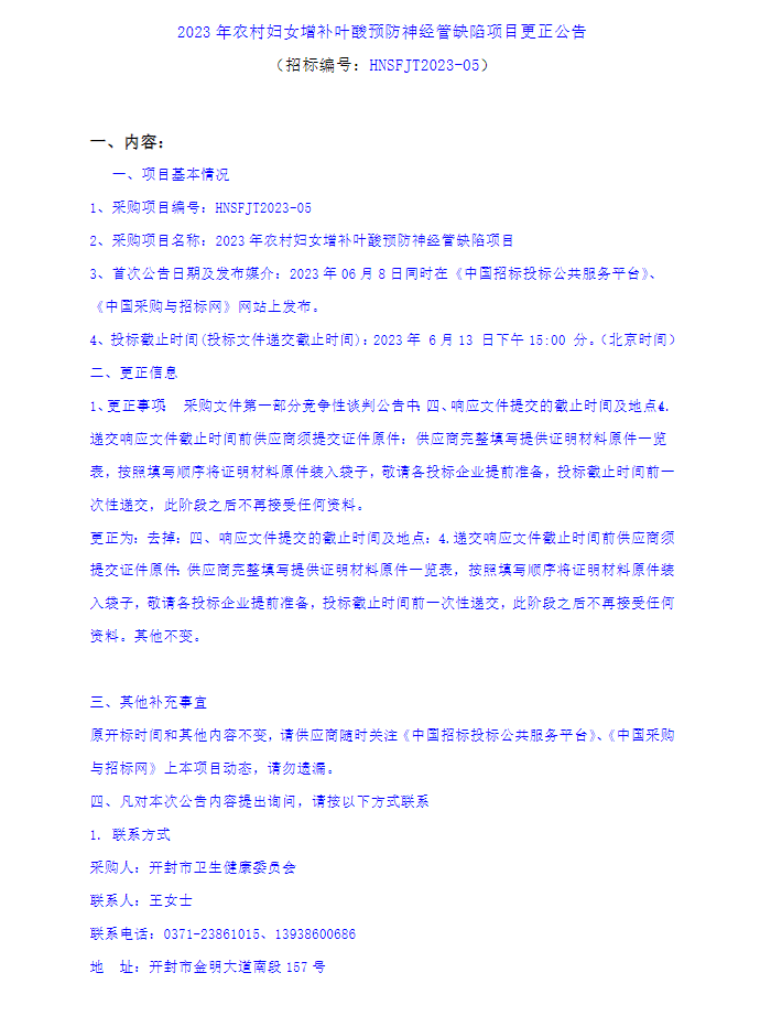 【开封市卫生健康委员会】河南省开封市卫生健康委员会2023年农村妇女增补叶酸预防神经管缺陷项目更正公告