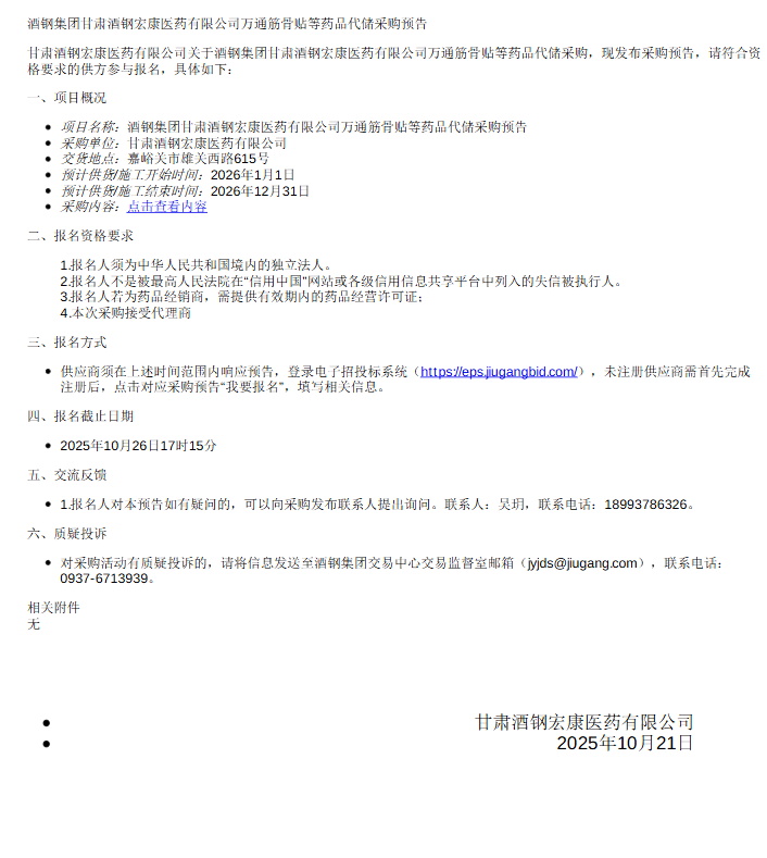 【甘肃酒钢宏康医药有限公司】酒钢集团甘肃酒钢宏康医药有限公司万通筋骨贴等药品代储采购预告