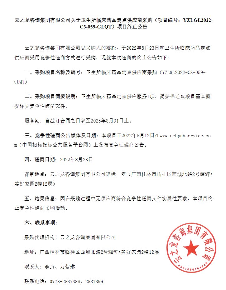 【桂林】云之龙咨询集团有限公司关于卫生所临床药品定点供应商采购(编号:YZLGL2022-C3-059-GLQT)终止公告