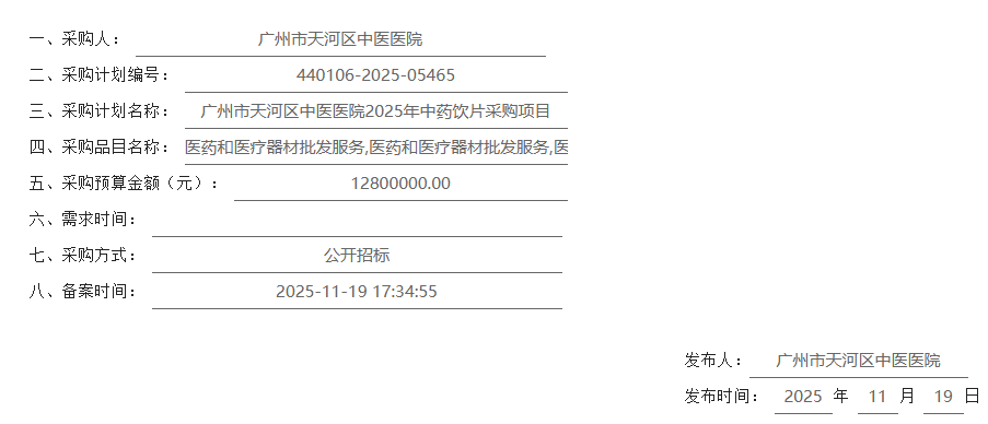 【广州市天河区中医医院】广东省广州市天河区中医医院2025年中药饮片采购项目