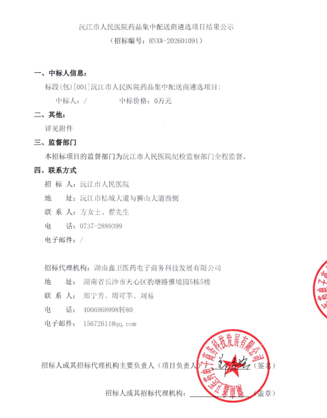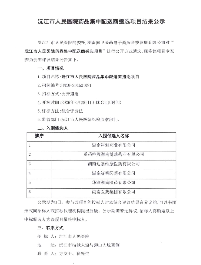 【益阳市沅江市人民医院】湖南省沅江市人民医院药品集中配送商遴选项目结果公示
