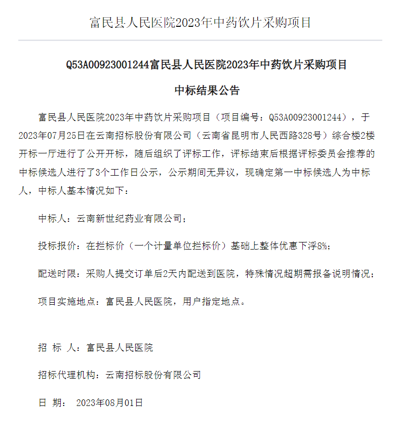 【昆明市富民县人民医院】云南省昆明市富民县人民医院2023年中药饮片采购项目招标结果公告