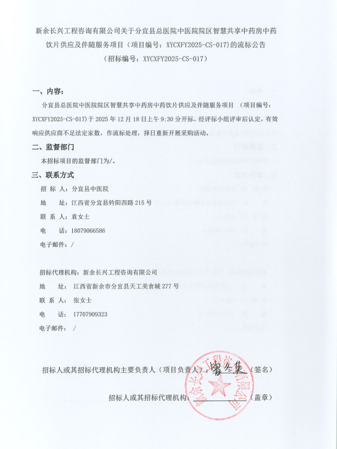 【新余市分宜县总医院】江西省新余长兴工程咨询有限公司关于分宜县总医院中医院院区智慧共享中药房中药饮片供应及伴随服务项目(项目编号:XYCXFY2025-CS-017)的流标公告