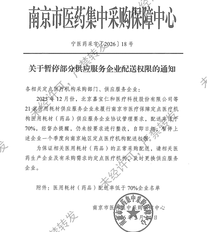 【南京】宁医药采字〔2026〕18号-关于暂停部分供应服务企业配送权限的通知