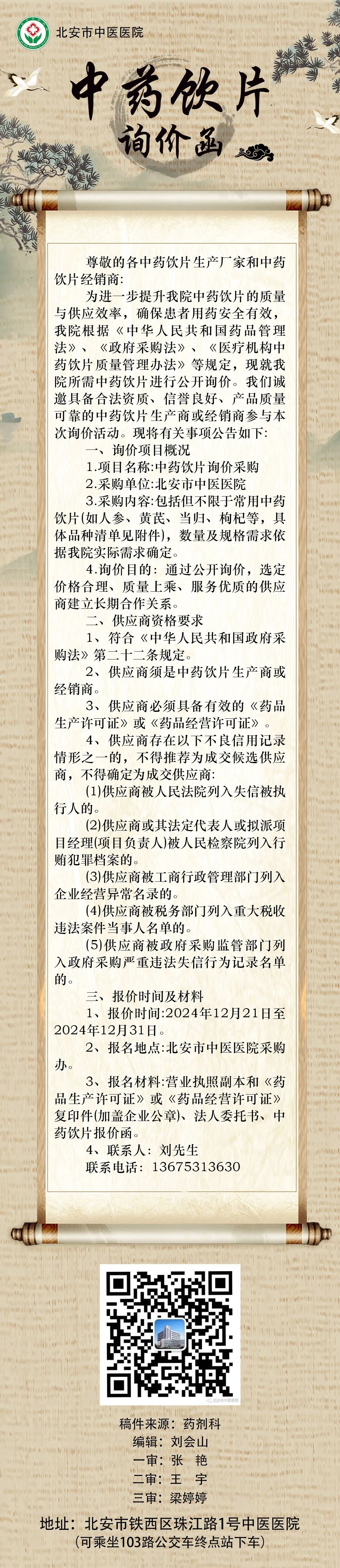 【黑河市北安市中医医院】黑龙江省黑河市北安市中医医院中药饮片项目询价公告