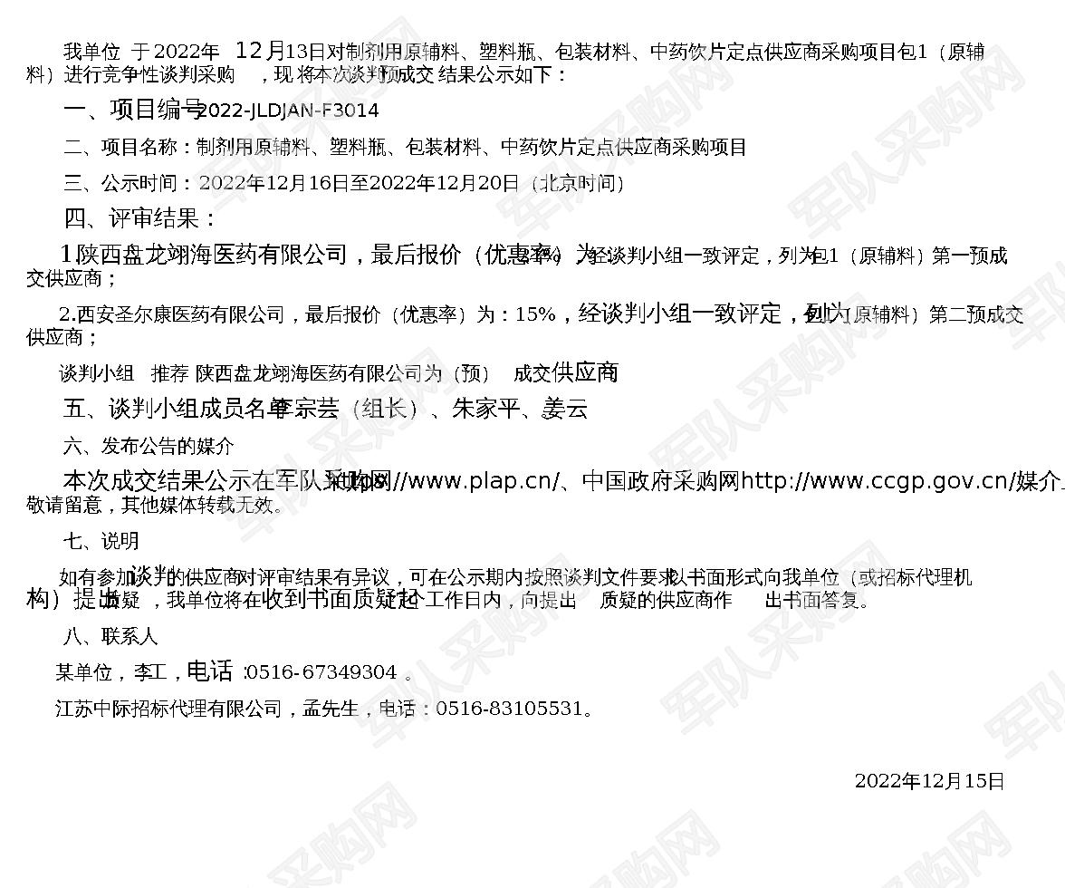 【军队采购】军队采购网某单位制剂用原辅料、塑料瓶、包装材料、中药饮片定点供应商采购项目包一竞争性谈判成交结果公示(2022-JLDJAN-F3014)