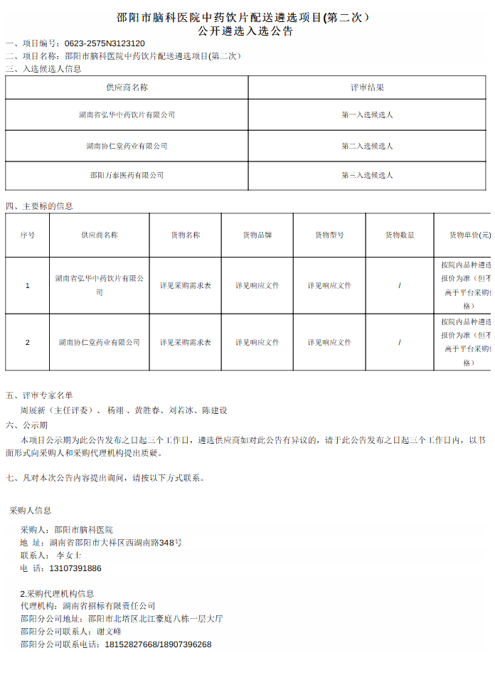 【邵阳市脑科医院】湖南省邵阳市脑科医院中药饮片配送遴选项目(第二次)公开遴选入选公告