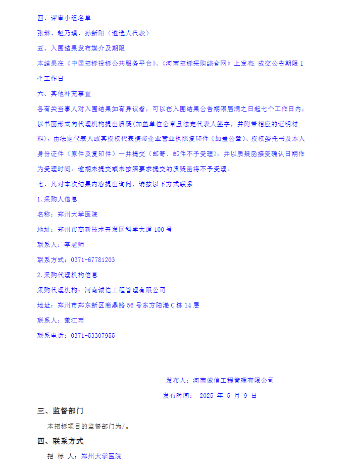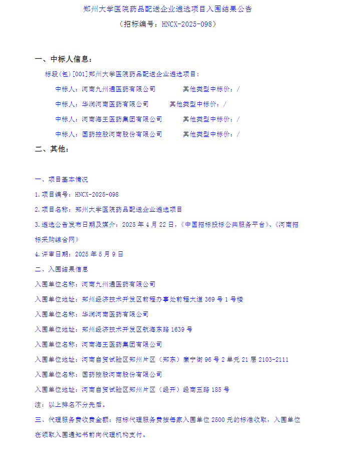 【郑州大学医院】河南省郑州大学医院药品配送企业遴选项目入围结果公告