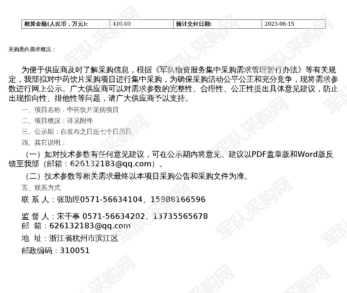 【军队采购】军队采购网中药饮片采购项目意向公开