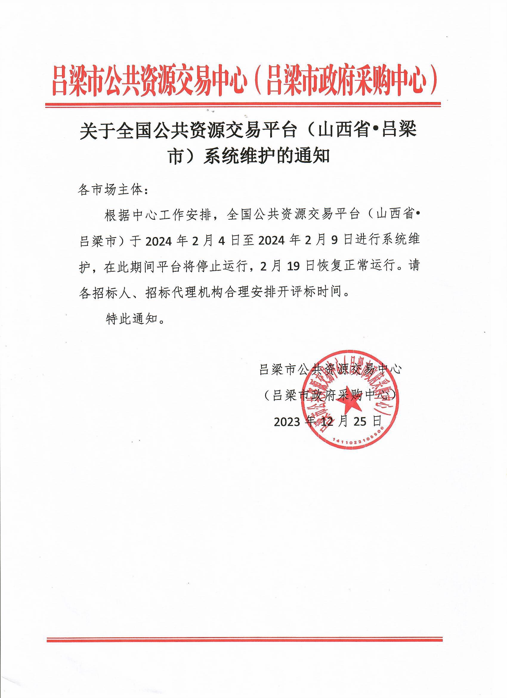 【吕梁】关于全国公共资源交易平台(山西省·吕梁市)系统维护的通知