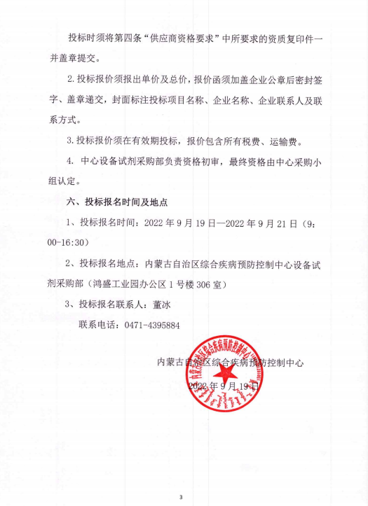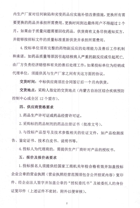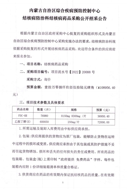 【内蒙古综合疾控中心】结核病防治科结核病药品采购公开招采公告