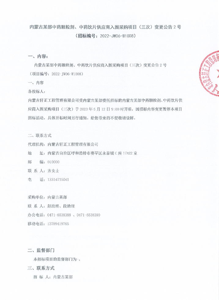 【内蒙古某部】内蒙古某部中药颗粒剂、中药饮片供应商入围采购项目(三次)变更公告2号