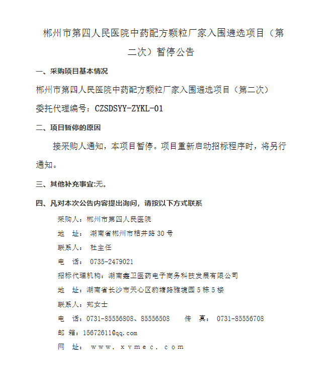 【郴州市第四人民医院】湖南省郴州市第四人民医院中药配方颗粒厂家入围遴选项目(第二次)暂停公告