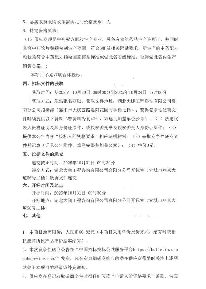 【襄阳市宜城市人民医院】湖北省宜城市人民医院中药配方颗粒配送企业遴选项目(二次)竞争性磋商公告