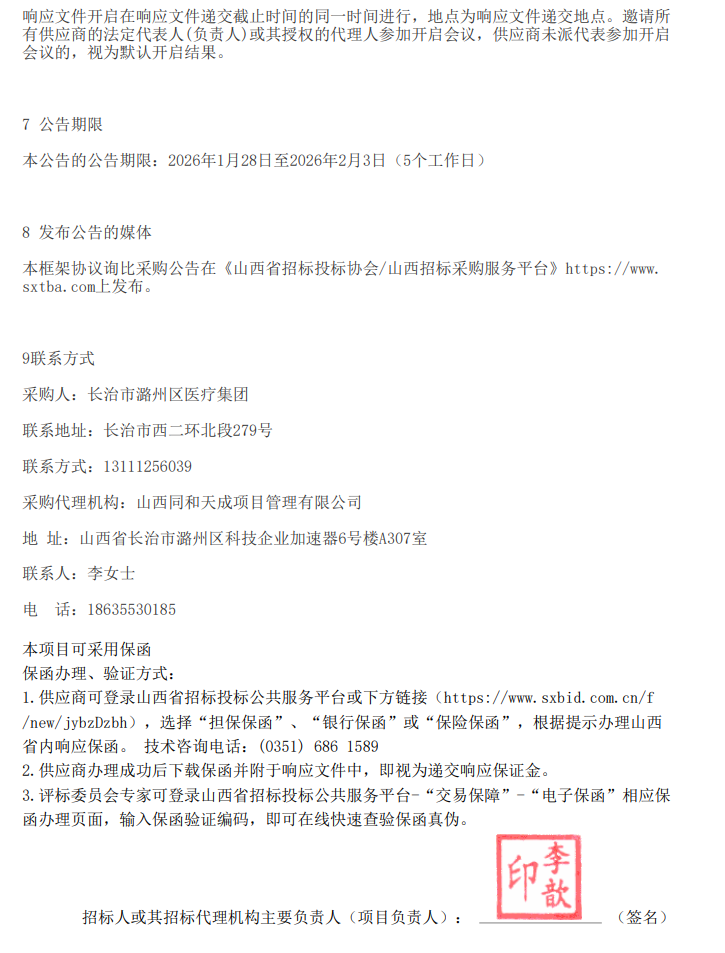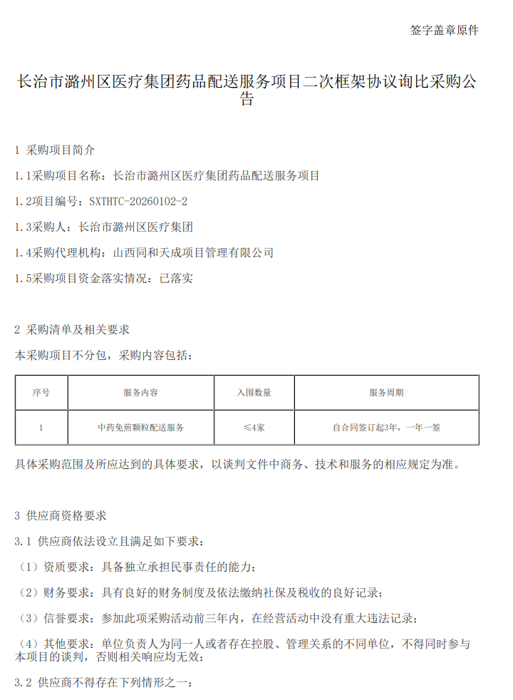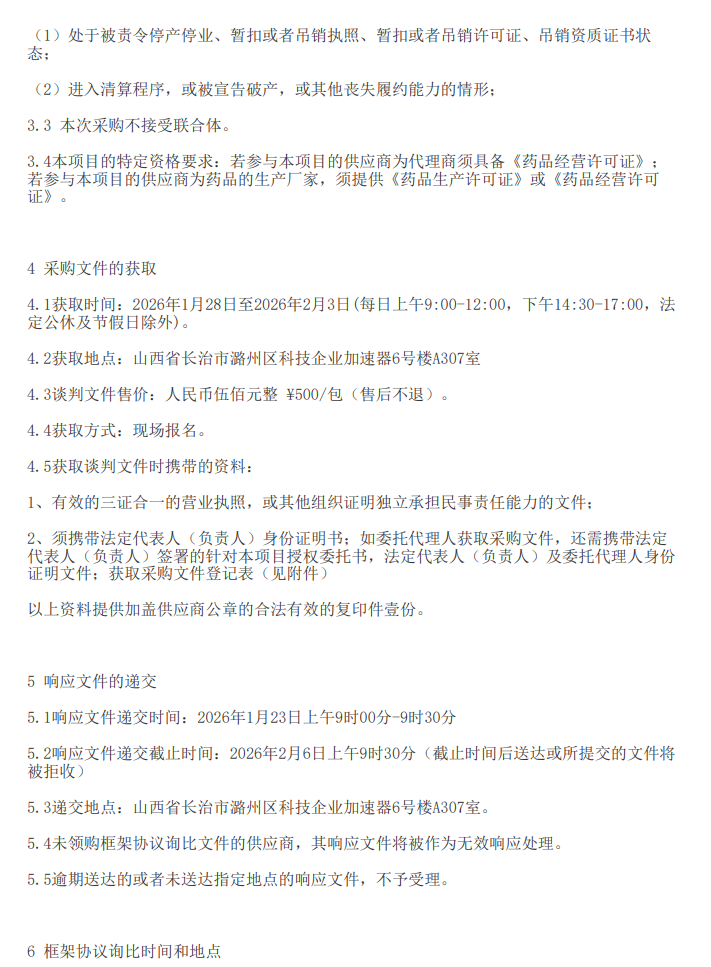 【长治市潞州区医疗集团】山西省长治市潞州区医疗集团药品配送服务项目二次框架协议询比采购公告
