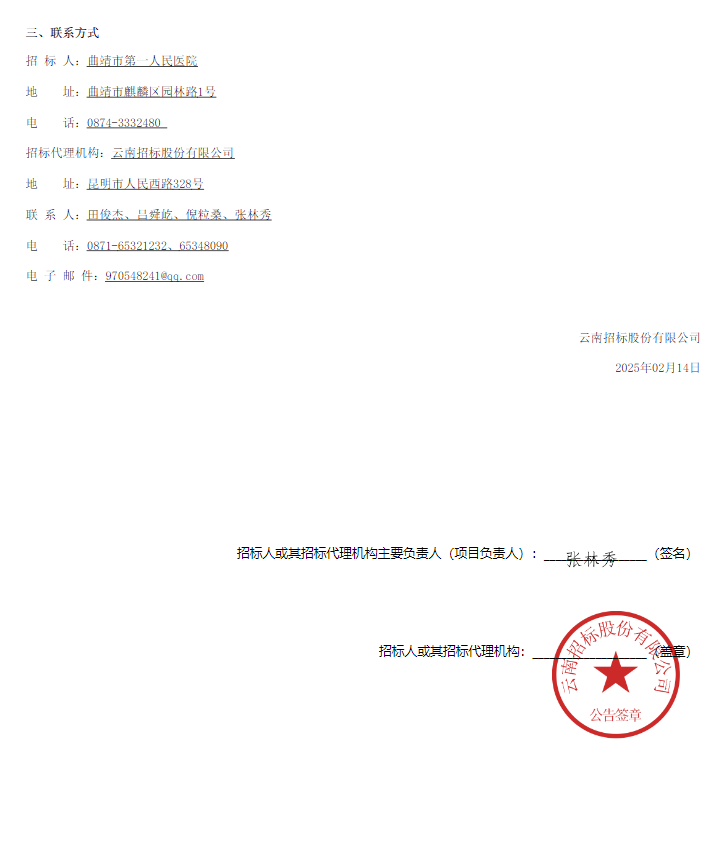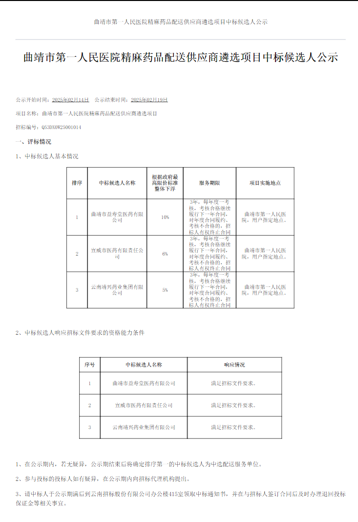 【曲靖市第一人民医院】云南省曲靖市第一人民医院精麻药品配送供应商遴选项目中标候选人公示