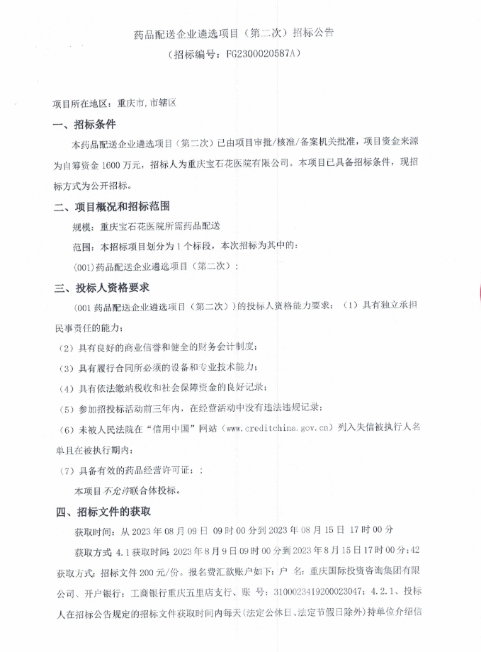 【重庆宝石花医院】重庆宝石花医院药品配送企业遴选项目(第二次)招标公告