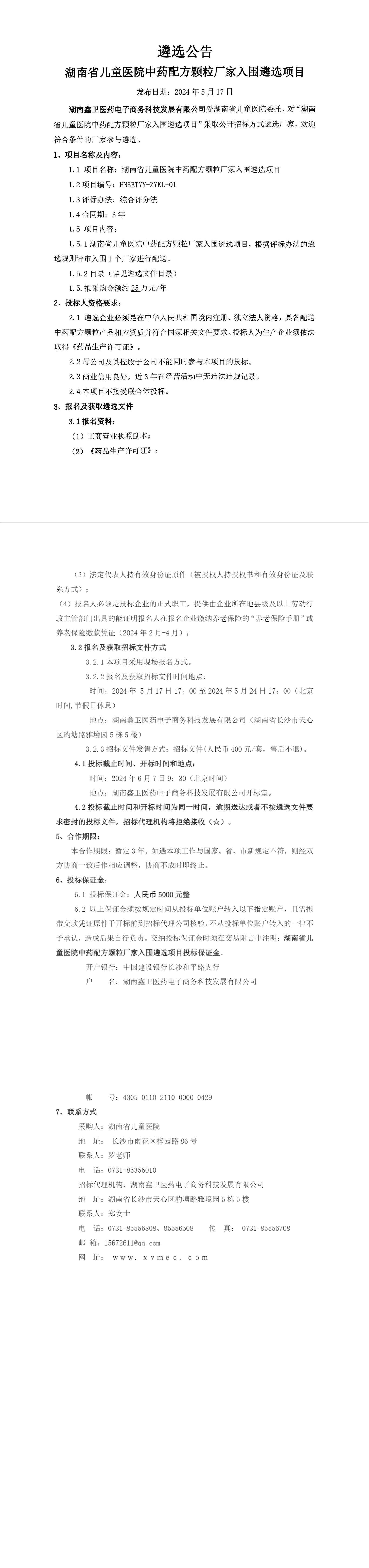 【湖南省儿童医院】湖南省儿童医院中药配方颗粒厂家入围遴选项目遴选公告