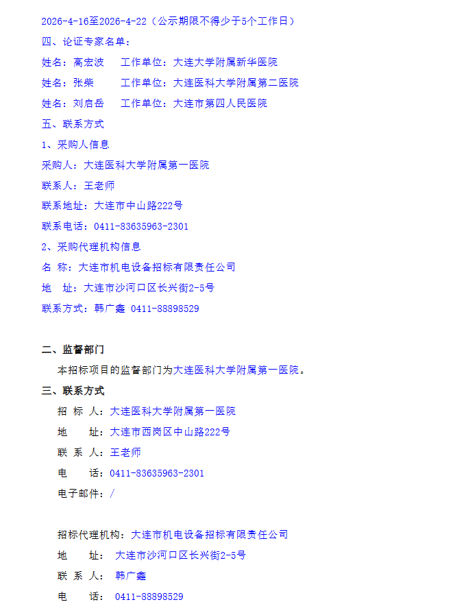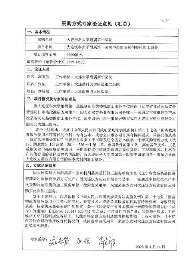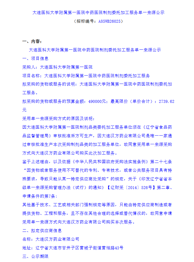 【大连医科大学附属第一医院】辽宁省大连医科大学附属第一医院中药医院制剂委托加工服务单一来源公示