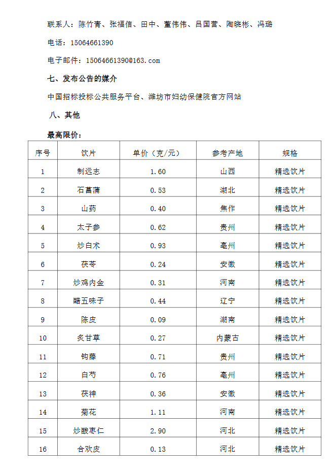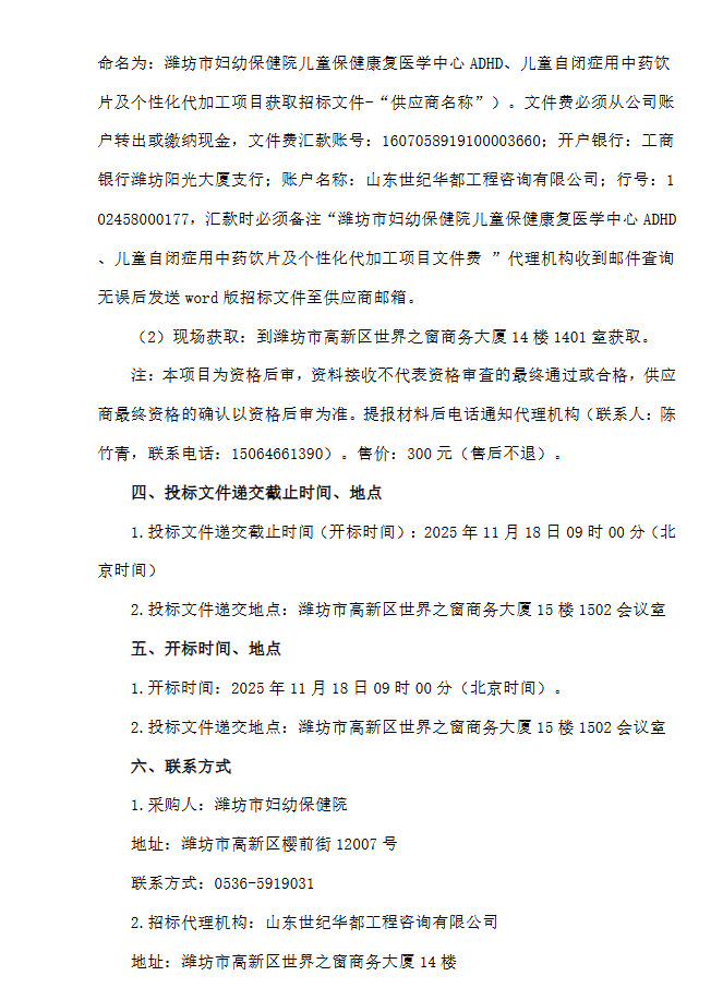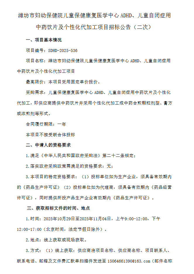 【潍坊市妇幼保健院】山东省潍坊市妇幼保健院儿童保健康复医学中心ADHD、儿童自闭症用中药饮片及个性化代加工项目招标公告(二次)