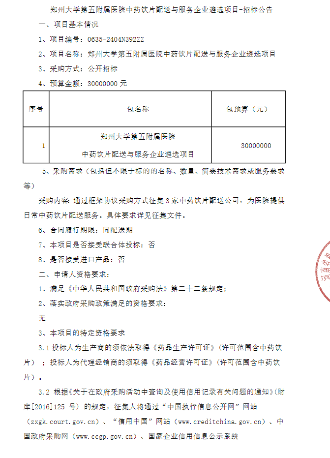 【郑州大学第五附属医院】河南省郑州大学第五附属医院中药饮片配送与服务企业遴选项目-公开招标公告