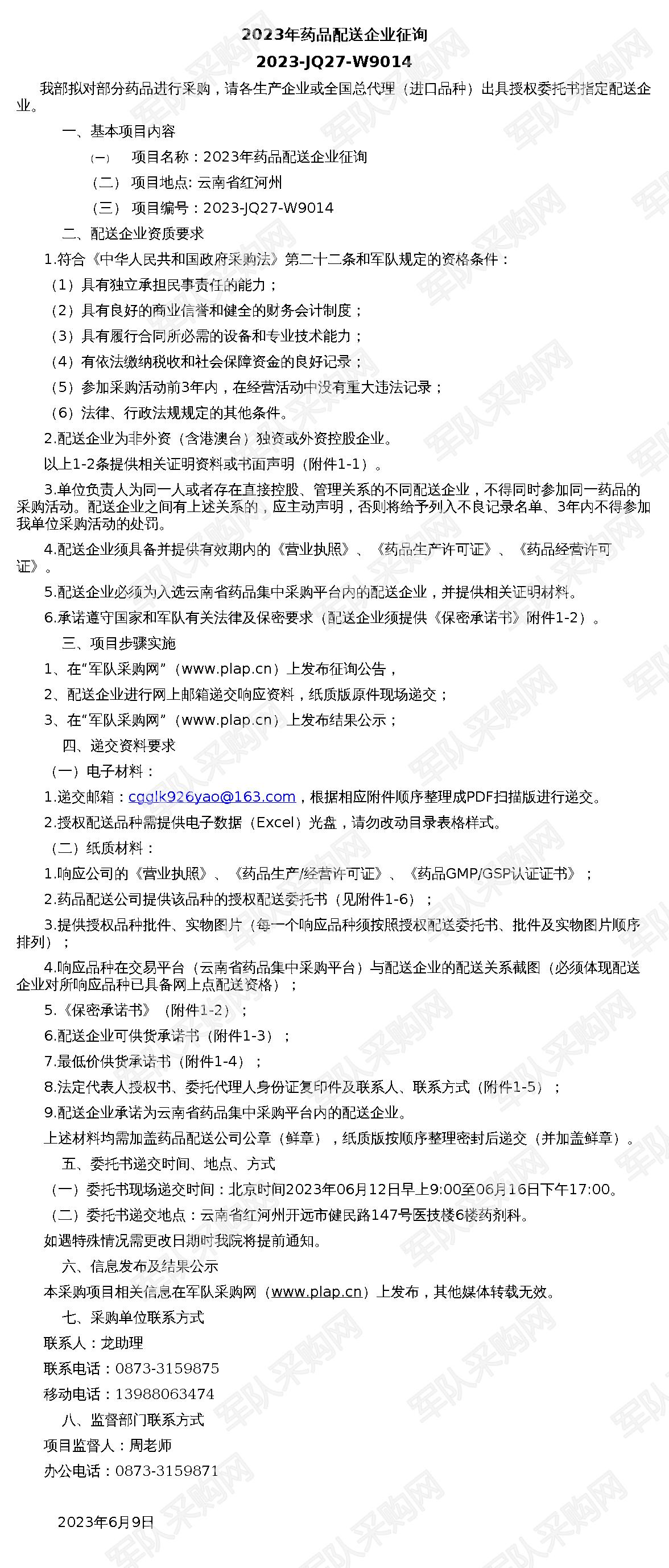 【军队采购】军队采购网2023年药品配送企业征询2023-JQ27-W9014