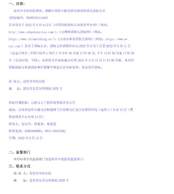 【云南昆明市中医医院】云南昆明市中医医院毒性、麻醉中药饮片配送供应商采购流标公示
