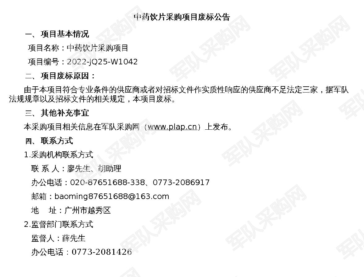 【军队采购】军队采购网中药饮片采购项目废标公告(2022-JQ25-W1042)