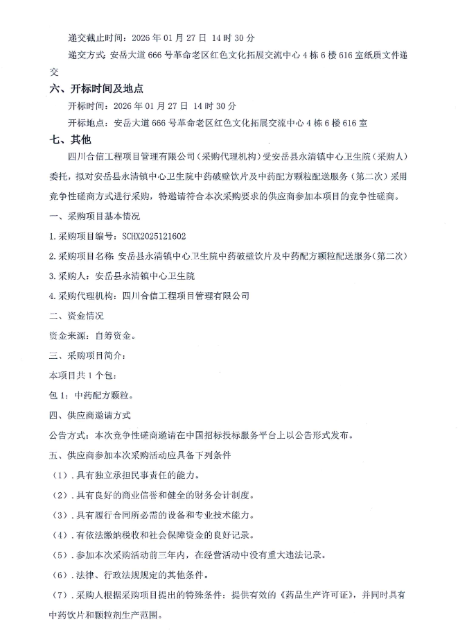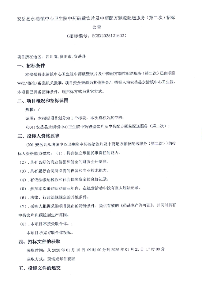 【资阳市安岳县永清镇中心卫生院】四川省资阳市安岳县永清镇中心卫生院中药破壁饮片及中药配方颗粒配送服务(第二次)招标公告