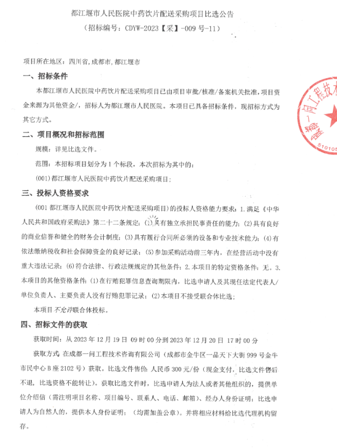 【成都市都江堰市人民医院】四川省成都市关于都江堰市人民医院中药饮片配送采购项目的废标公告