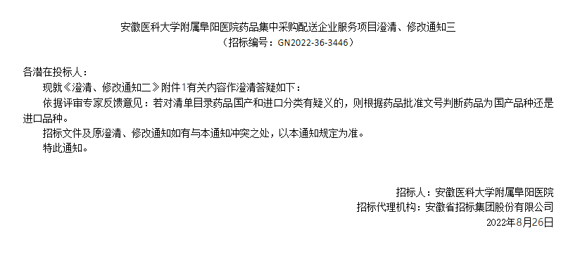 【阜阳医院】安徽医科大学附属阜阳医院药品集中采购配送企业服务项目澄清、修改通知三
