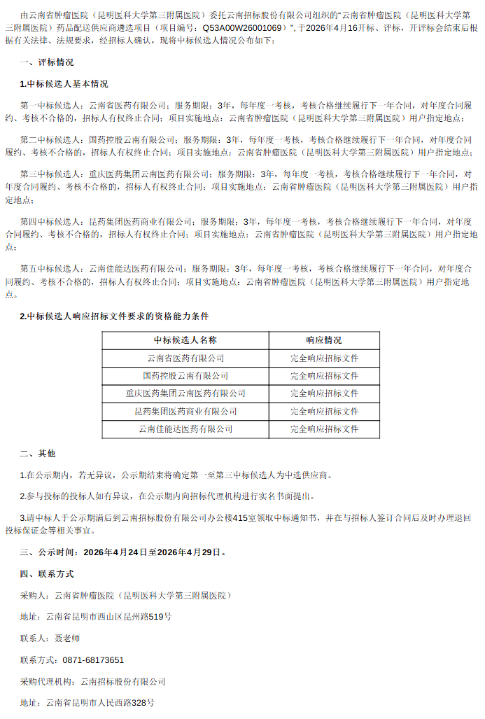 【云南省肿瘤医院】云南省肿瘤医院(昆明医科大学第三附属医院)药品配送供应商遴选项目中标候选人公示