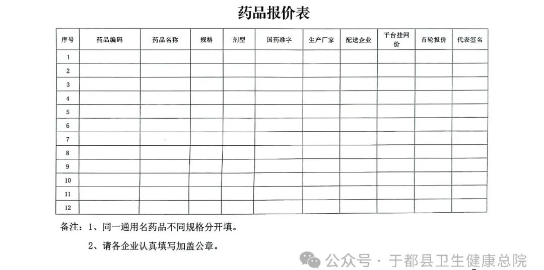 根据《关于全面推进紧密型县域医疗卫生共同体建设的指导意见》(国卫基层发〔2023〕41号)文件要求,为响应全面推进紧密型医共体建设的国家战略,优化于都县卫生健康总院(以下简称“总院”)药品管理体系,依据《关于抓好紧密型县域医共体建设工作落实的通知》(赣卫体改字〔2024〕1号)以及《于都县卫生健康总院关于加强院内药品统一采购管理的通知》相关要求,总院决定对所需药品进行统一线下带量议价采购。现公开诚邀符合条件的药品生产企业参与,具体事宜公告如下: