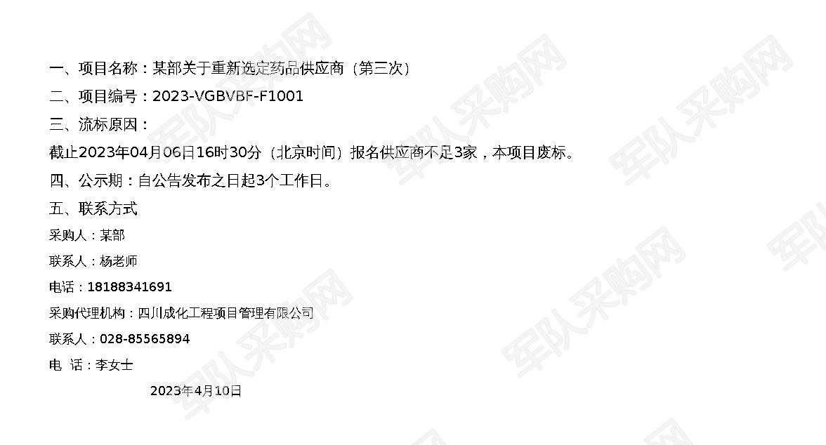 【军队采购】军队采购网某部关于重新选定药品供应商(第三次)询价采购废标公告(2023-VGBVBF-F1001)