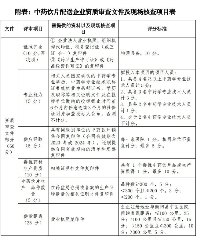为规范我院中药饮片采购工作,确保采购过程的公开、公平、公正,提升医院中药饮片质量,降低患者用药负担,根据《衡阳县中医医院中药饮片采购招标工作方案》,对我院中药饮片配送企业进行遴选,欢迎符合条件的投标人参与投标。 1、项目名称:中药饮片配送企业遴选 2、项目目的:满足医院临床需求 3、合同期限:1年。如遇本项工作与国家、省、市新规定不符,则经双方协商一致后作相应调整,协商不成时即终止。合同期结束,根据企业配送饮片质量、配送及时率、服务等进行综合量化评分,高于60分者保留配送资格,低于60分者取消配送资格;经评估审核合格,可具备为我院下年度配送中药饮片的资格。 4、投标人资格要求: 4.1投标企业必须是在中华人民共和国境内注册、独立法人资格,符合中药饮片配送国家相关政策文件要求。投标人为生产企业的须依法取得《药品生产许可证》,并具有相应生产认证范围;投标人为经营企业或代理公司的须依法取得《药品经营许可证》。 4.2商业信用良好,近3年在经营活动中无违法违规记录; 4.3本项目不接受联合体投标。 5、遴选数量 本着质量优良、价格低廉、供应快捷方便的原则,我院拟遴选10 家中药饮片配送企业为我院中药饮片配送企业。 6、报名 6.1报名时间:2025年1月10日8:00时至2025年1月16日17:30时,逾期不予受理。 接受报名的时间为工作日的上午8:00-12:00,下午14:30-17:30(北京时间) 6.2报名方式:现场报名 6.3报名地址:衡阳县中医医院中药科(门诊楼一楼南栋) 7、报名材料审核 7.1投标企业现场报名时必须提供以下资料(以下资料除被授权人身份证原件外,其他资料需加盖投标企业公章): (1)营业执照副本、组织机构代码证副本、税务登记证副本或三证合一; (2)《药品生产许可证》或《药品经营许可证》; (3)法人委托授权书、法人及法人委托人身份证、上岗证、社保证明。 (4)投标企业参加此招标前三年内,在生产经营活动中无重大违法违纪违规记录,并提供“信用中国”网站(www.creditchina.gov.cn)截图; (5)联系人姓名、电话、邮箱。 8、投标须知 报名材料审核合格的企业按《中药饮片配送企业资质审查文件及现场核查项目表》(见附表)的要求,先准备资质审查文件部份(60分),胶装成册加盖企业公章并密封,于2025 年1月17日下午5:30前交衡阳县中医医院中药科,逾期视为自动放弃。医院对各企业资质审查文件部分进行审核并打分,选取资质审查文件部分得分靠前的企业(如报名企业少于10家则选取资质符合要求的企业),医院将到企业进行现场核查部分(40分)核查并打分。资质审查文件部分和现场核查部分打分相加总分排名前10名的企业,遴选为我院中药饮片配送企业。其他未约定事项,按照招标相关法律法规执行。 企业在递交医院的相关材料中有隐瞒事实、弄虚作假的行为,或有不按要求如实提供有关情况、文件、证明等资料的行为,或有所提供的有关情况、文件、证明等资料与经查实的事实不符的行为,且上述行为对该企业有利的,该企业将被判定为不合格,并取消其在我院2年内的中药饮片配送企业遴选资格。 9、联系方式 招标人:衡阳县中医医院 地 点:湖南省衡阳县西渡镇洪山南路 联系人:徐先生 电 话:0734-6655181