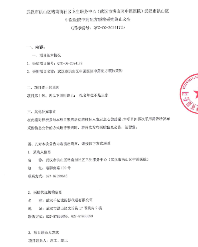 【武汉市洪山区珞南街社区卫生服务中心】湖北武汉市洪山区珞南街社区卫生服务中心(武汉市洪山区中医医院)武汉市洪山区中医医院中药配方颗粒采购终止公告