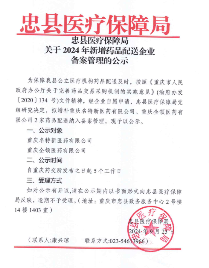 【重庆】忠县医保局关于2024年新增药品配送企业备案管理的公示