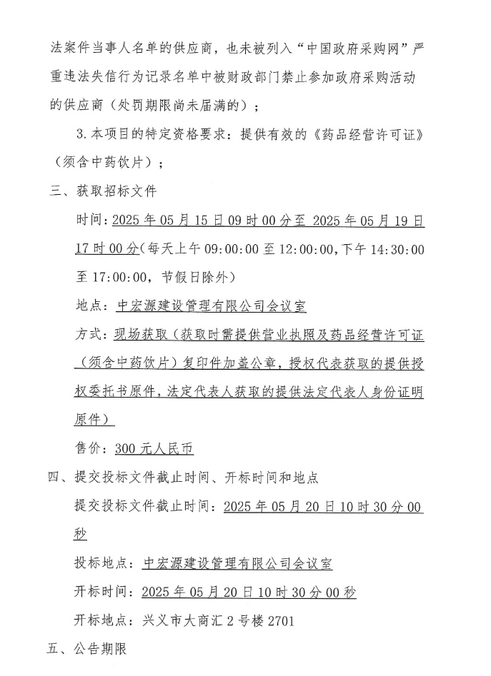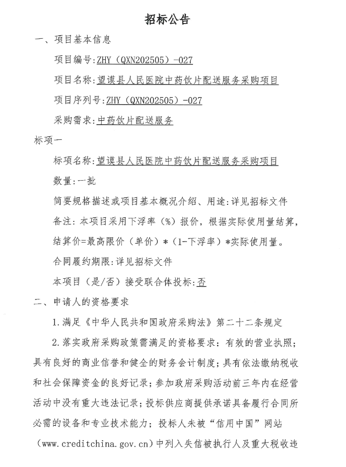 【黔西南布依苗族自治州望谟县人民医院】贵州省黔西南布依苗族自治州望谟县人民医院中药饮片配送服务采购项目招标公告