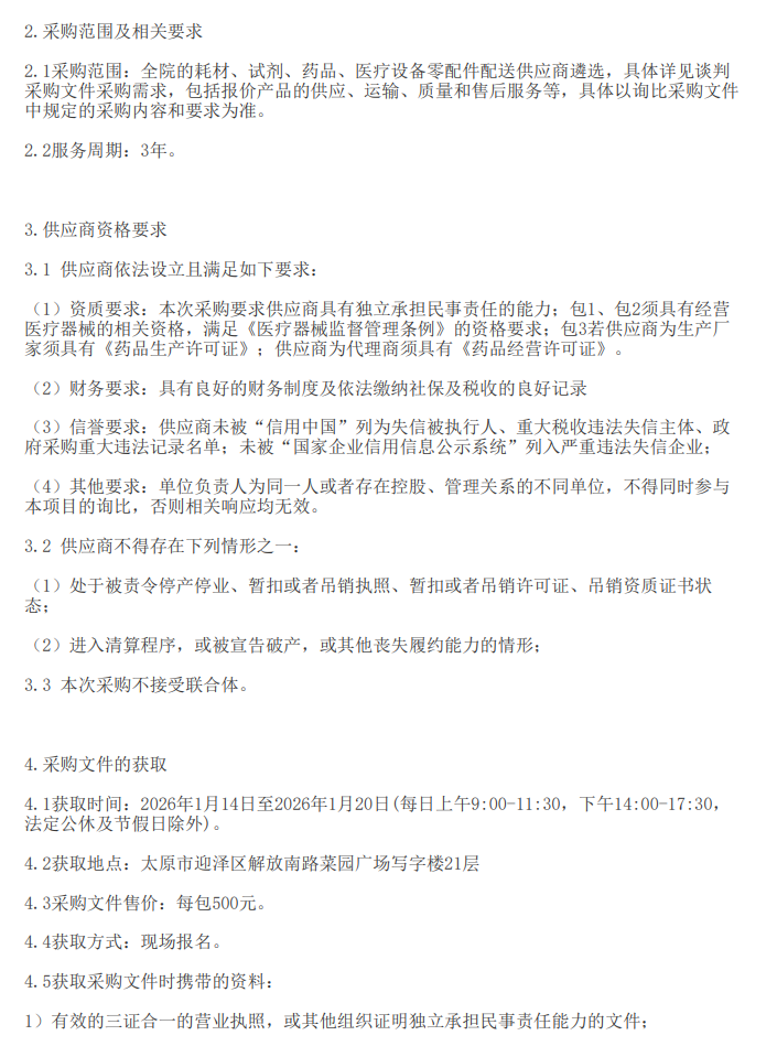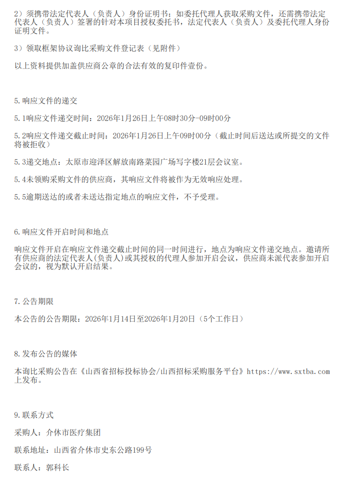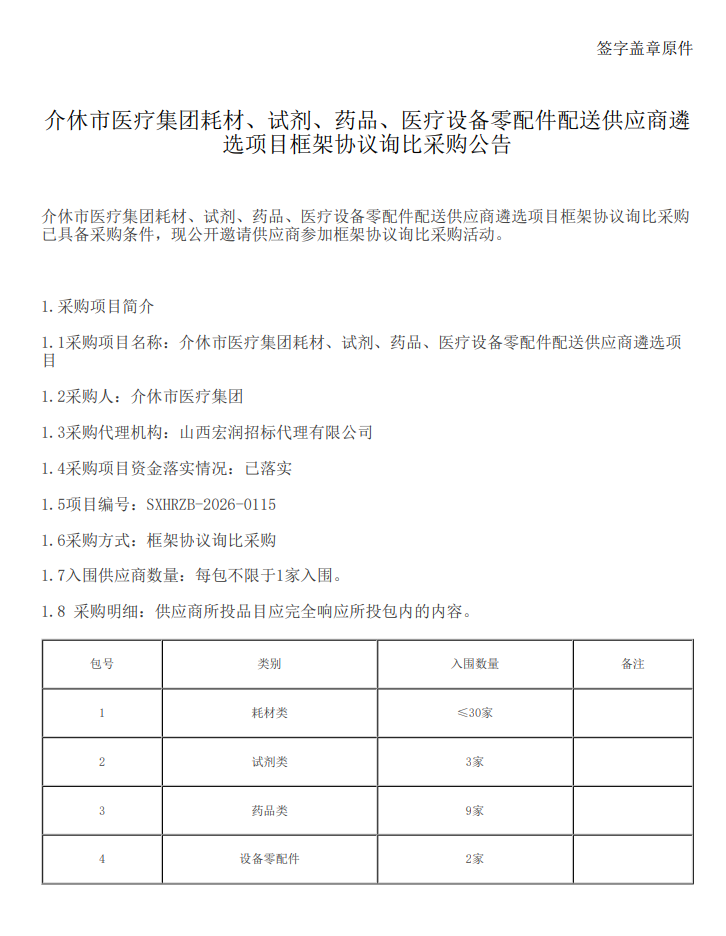 【晋中市介休市医疗集团】山西省晋中市介休市医疗集团耗材、试剂、药品、医疗设备零配件配送供应商遴选项目框架协议询比采购公告