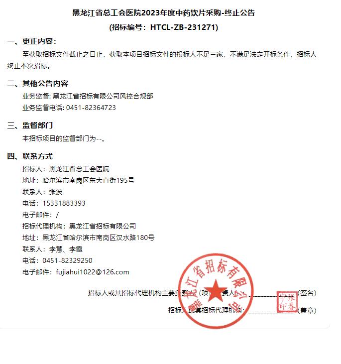 【黑龙江省总工会医院】黑龙江省总工会医院2023年度中药饮片采购-终止公告