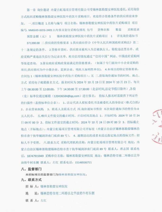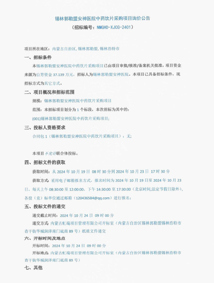 【锡林郭勒盟安神医院】内蒙古自治区锡林郭勒盟安神医院中药饮片采购项目询价公告