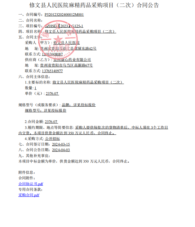 【贵阳市修文县人民医院】贵州省贵阳市修文县人民医院麻精药品采购项目(二次)-修文县人民医院麻精药品采购项目(二次)合同公示