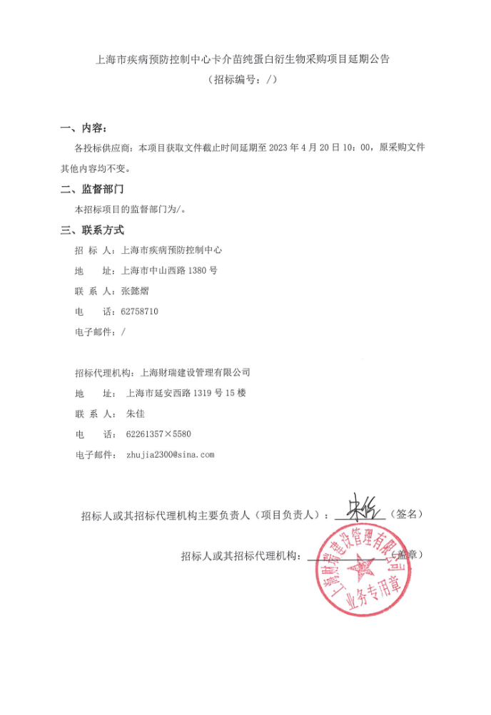 【上海市疾病预防控制中心】上海市疾病预防控制中心卡介苗纯蛋白衍生物采购项目延期公告(20230407)