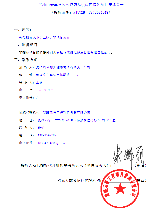 【克拉玛依市黑油山老年社区】新疆维吾尔自治区克拉玛依市黑油山老年社区医疗药品供应商请购项目废标公告